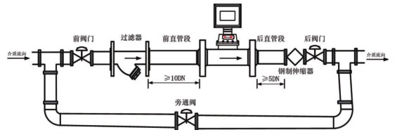 5、流量計應(yīng)水平安裝。建議在流量計后直管段后側(cè)安裝鋼制伸縮器(補(bǔ)償器),伸縮器必須符合管道設(shè)計的公稱通徑和公稱壓力的要求。伸縮器是作為管道應(yīng)力的補(bǔ)償及方便流量計的安裝與拆卸。