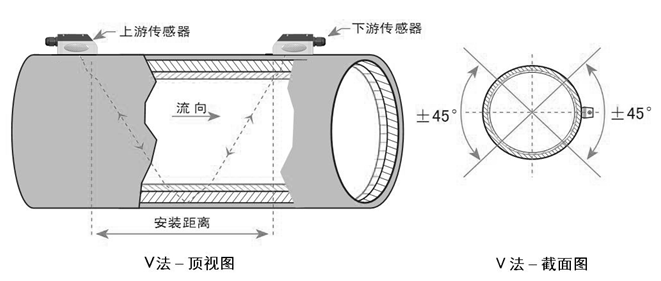 一般情況下,V法是比較標準的安裝方法,使用方便,測量準確,安裝時兩傳感器水平對齊,其中心線與管道軸線水平即可,可測管徑范圍為DN15mm~DN400mm。
