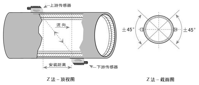 當管道很粗或由于液體中存在懸浮物、管內壁結垢太厚或襯里太厚等原因,造成V法安裝信號弱,機器不能正常工作時,就需要選用Z法安裝。Z法的特點是超聲波在管道中直接傳輸,沒有反射(稱為單聲程),信號衰耗小。