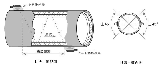 N法的特點是通過延長超聲波傳輸距離來提高測量精度。使用N法安裝時,超聲波束在管道中反射兩次穿過流體三次(稱為三聲程),適于測量小管徑管道。