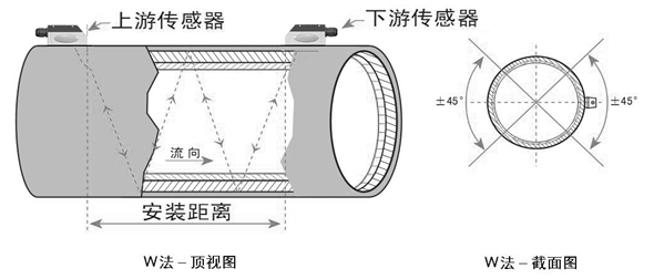外夾式傳感器的安裝方式有四種。分別是V法、Z法、N法和W法(詳見安裝示意圖)。