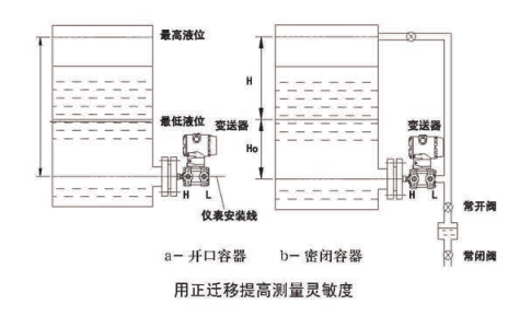 變送器的正遷移適用于敞口或非敞口容器內(nèi)液位的測量。安裝時正壓室連接容器接口,負壓室與大氣或者低壓側(cè)相通。
