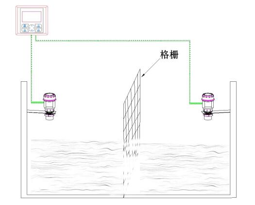 整套測量系統主要由顯示儀表(控制器)和超聲波液位計(傳感器1、2)兩部分組成,傳感器不接觸被測水溶液,儀表顯示液位、液位差及工作狀態。